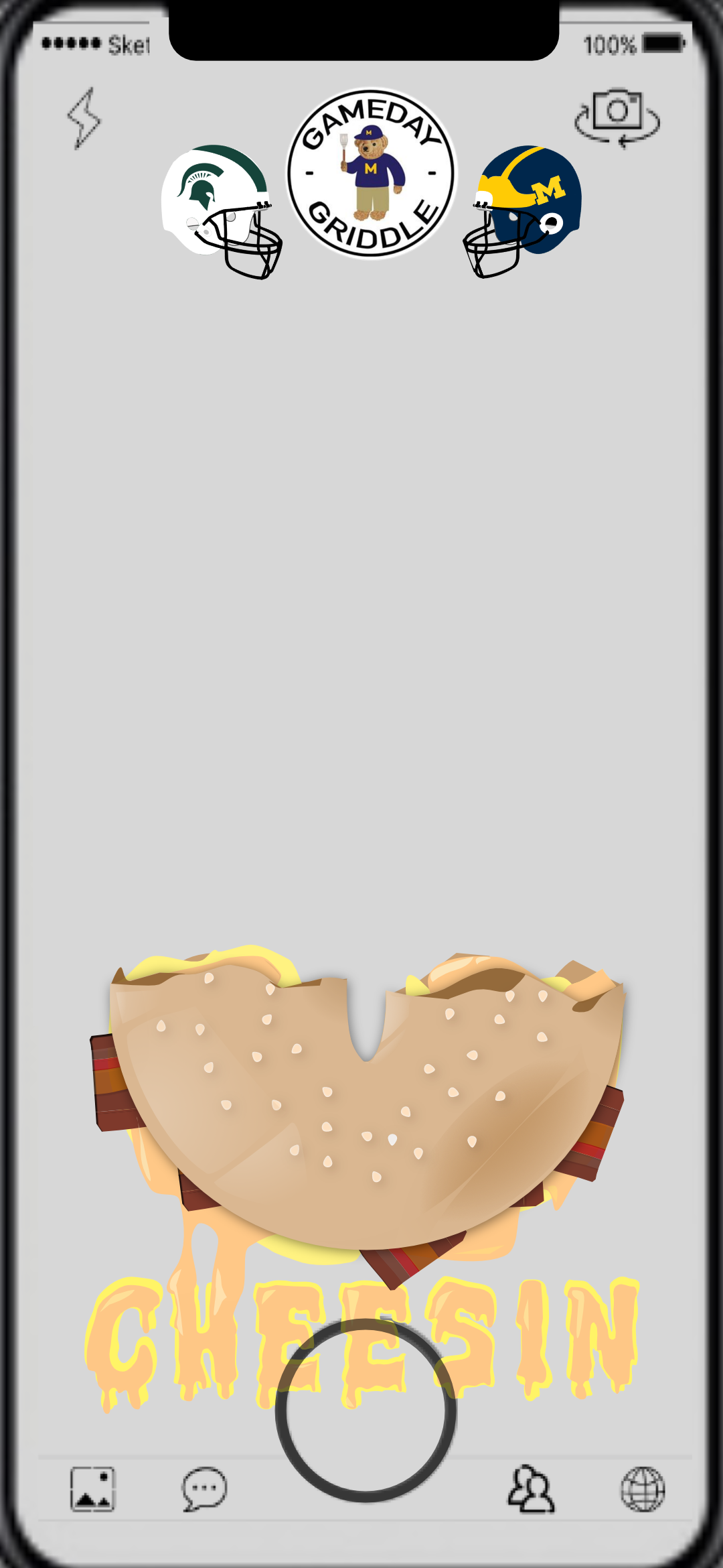 Allon designed vector graphics for an event-specific, geolocation-triggered camera filter to promote and further the branding of Gameday Griddle, a University of Michigan student food startup that primarily sold and delivered bacon, egg, and cheese sandwiches. The process involved several iterations and the locating/sizing the geofence to trigger the filter. Some of the designs are below.