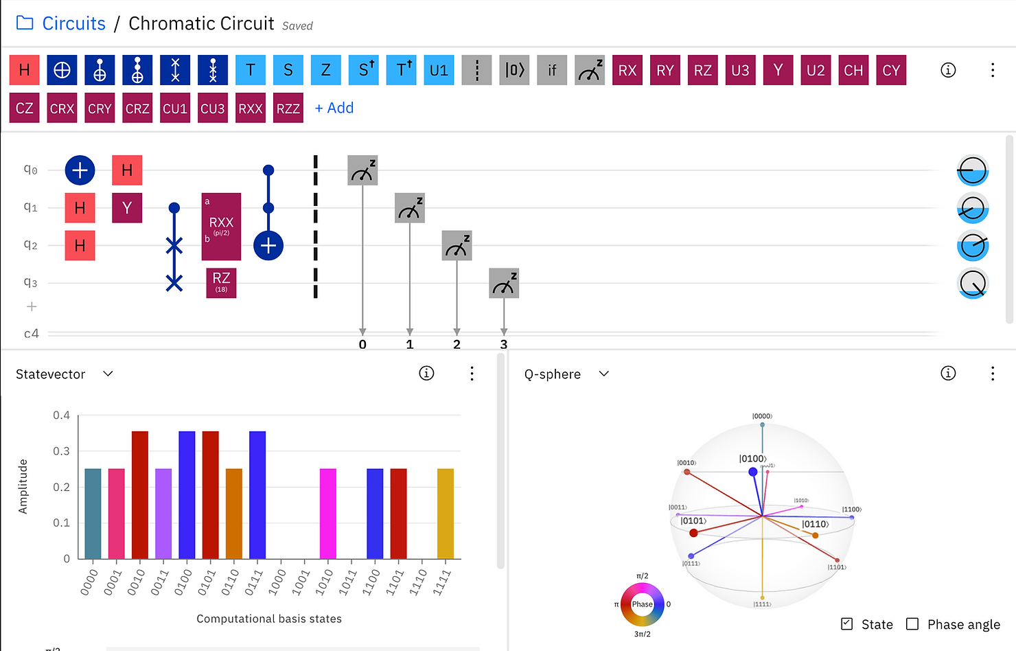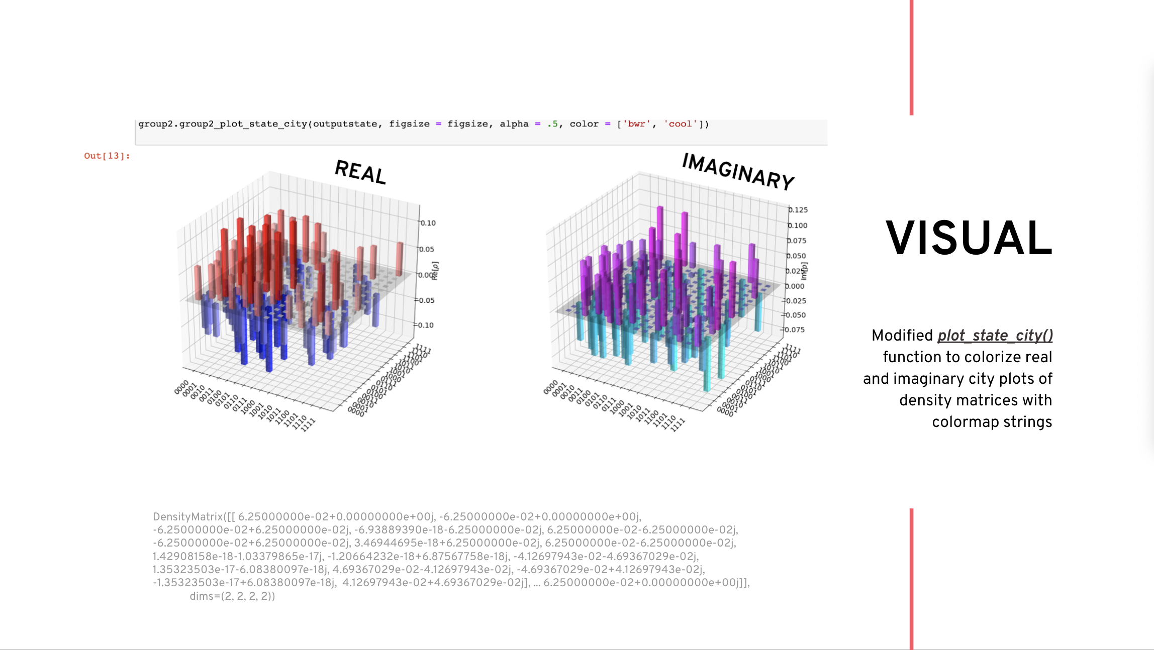 As an aside, Allon also took the Qiskit-native function plot_state_city() (which visualizes the density matrix) and made a modified version that was able to colorize the 3D bar graph with a specified colormap (individually for the real and imaginary components) with an optional opacity/translucency boolean. The modified visual can be seen below.